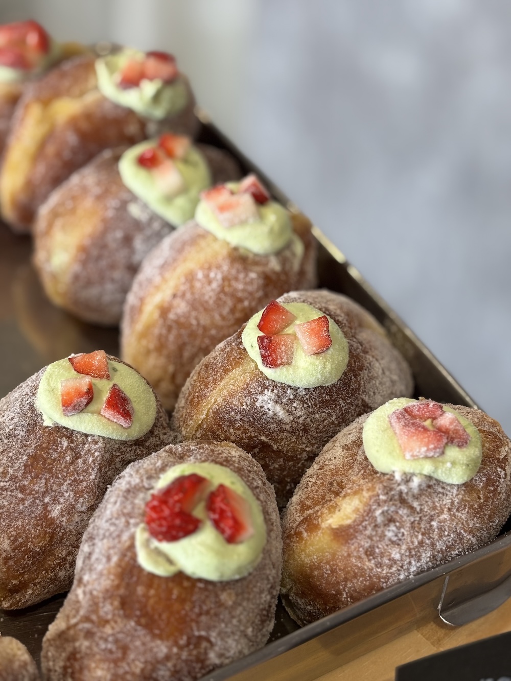 香川県産<さぬきひめ>のペーストを混ぜ込んだクリームを詰めた生ドーナツ400円は、仕上げに<和三盆>を加えたもの。ふわもち食感のブリオッシュ生地は、国産小麦を数種類ブレンドし砂糖の代わりに<和三盆>を加えた独自製法です。