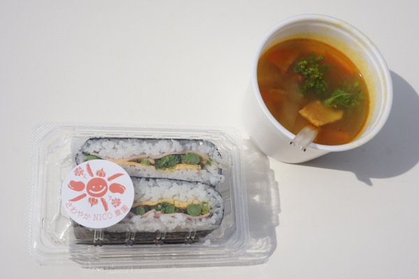 さわやかNico農園さんのおにぎらずとスープのセット!自分の畑で育てた菜の花がたっぷり入っています。