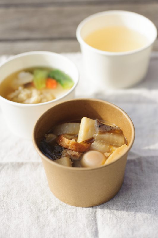 さわやかNICO農園さんの親鳥で出汁をとったおでんスープ。農園の大根入りで具だくさんの洋風おでんです。