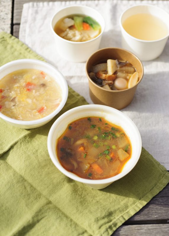 一番手前がスパイス家族カラクラさんの和風カレースープ。伊吹いりこを使用し、カレーの香りが食欲そそります。右一番奥の白いスープは畔屋さんの玄米スープ。