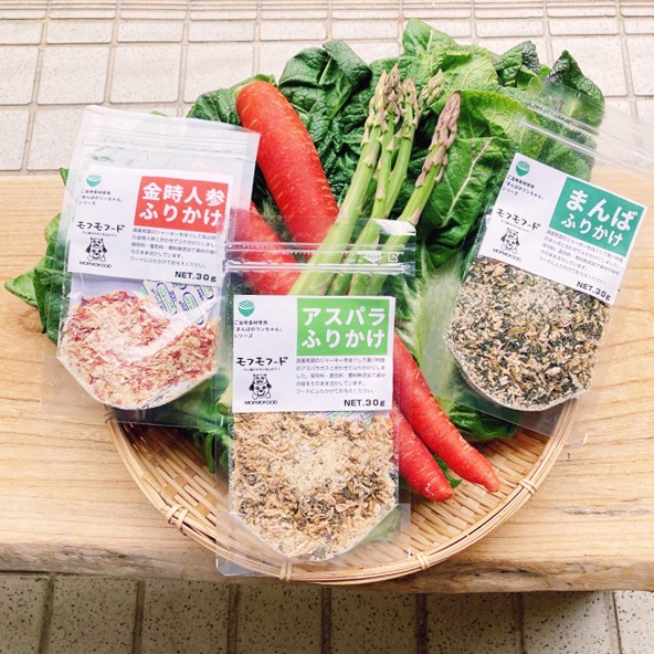 県産の<金時人参>や<まんば><アスパラ>を加えた鶏肉ふりかけは、自然な香りと甘みで食欲をくすぐります。ラインナップに県内各地で生産されているスーパーフードも加わり、ワンちゃんネコちゃんの健康を応援しています。