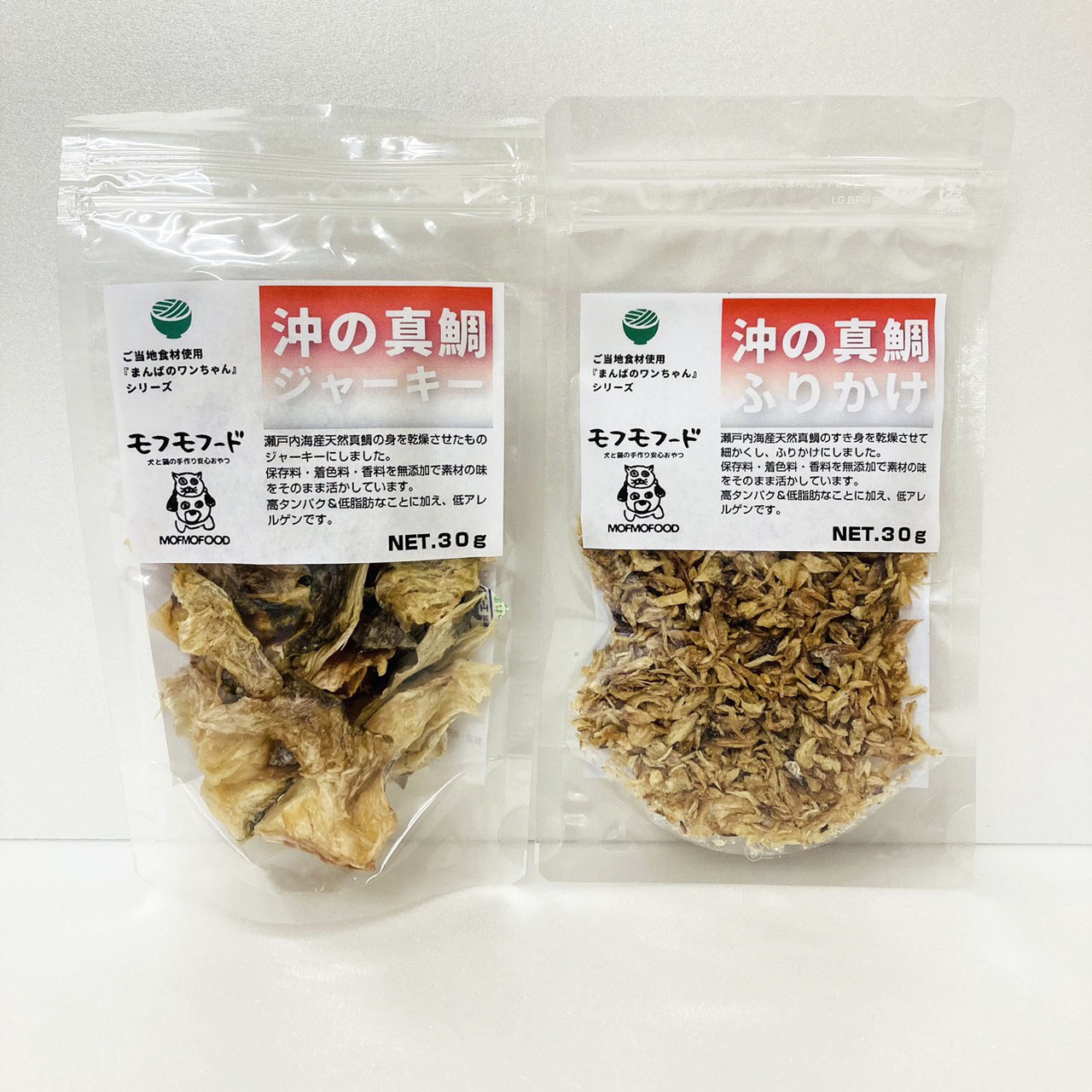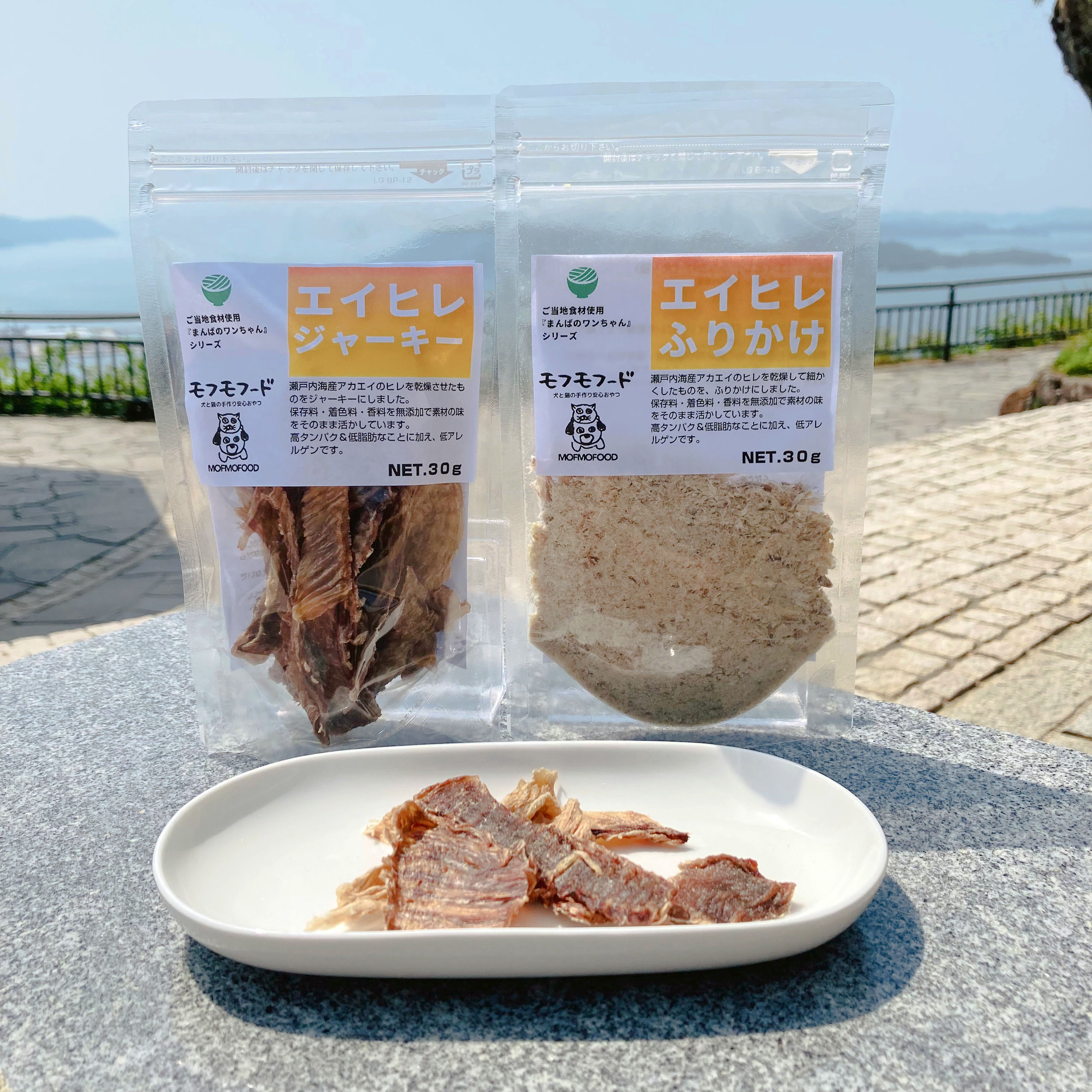 要望の多かった鶏肉アレルギーを持つペット用のおやつとして開発された、魚介のジャーキーとふりかけです。