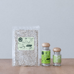 小豆島産のオリーブ葉を粉末化し、ハーブとして使用した調味塩。ハーブが引き立つよう、塩は特殊形状の岩塩を使用し、マジョラムやガーリック、ホワイトペッパーとブラックペッパーといった香辛料やハーブとブレンド。イタリアンをはじめフライドポテトやサラダなど様々な料理に合う万能調味塩。