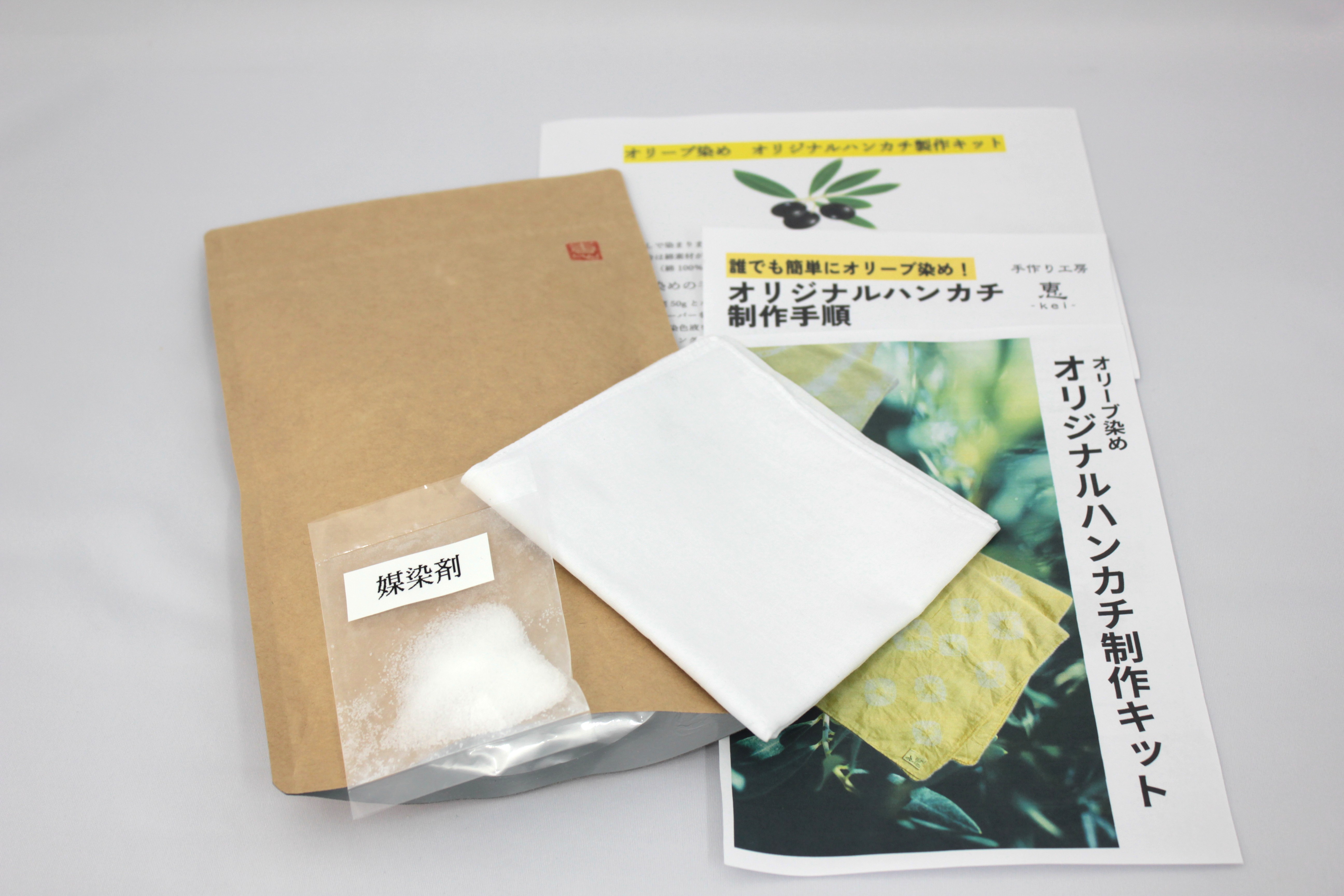 | 紹介文 | 香川県産オリーブの葉を使って自宅で気軽に草木染を体験できるクラフトキット。自分だけのハンカチづくりが可能。 |