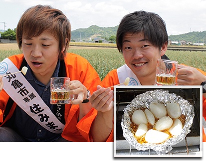 さて、いよいよ丸亀じゃんごの二人が待ち焦がれたにんにく料理です。森井さんの奥さんが調理してくれたのは、にんにくのホイル焼き!!にんにくを塩で味付けしてオリーブオイルで浸し、レンジでチン。ホイルをあけると、いい香りが。早速、食べてみると「ホクホクして、おいしい!」と、北村さんから思わず笑顔がこぼれます。香川県の特産品オリーブオイルとコラボレーションした一品は、ビールとの相性もよく、安場さんも「おつまみに最高!」とパクパク、ゴクゴク。にんにくは様々な料理に使われており、料理の香りをより豊かに、味わいをより引き立てます。まさに食材のオールラウンドプレーヤー。また、にんにくにはアリシンという成分が含まれ、疲労回復を助ける働きなどがあります。香りも味もよく、様々な料理に使えて体にもいい。そんな魅力を体感して、元気いっぱいになった丸亀じゃんごの二人でした。