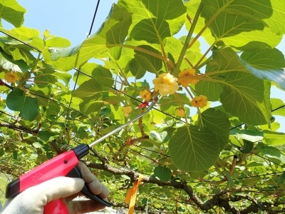5月上旬に花が咲くと、次は受粉作業です。キウイにはオスとメスの木があり、雄花の花粉を雌花に受粉することで実がなります。雄花は5月中旬に咲くので、前年の雄花の花粉をとっておき、粉末状にしたものを溶液に溶かして、ハンドスプレーで雌花に吹きつけます。受粉が成功すると1週間ぐらいで小さな実ができます。 -