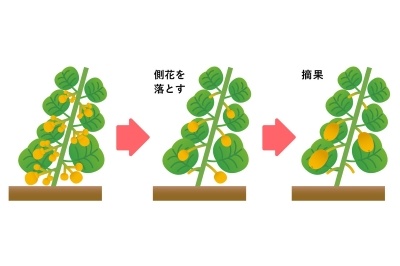 4月に花のつぼみができると、中心のつぼみの脇にある、2つの「側花(そくか)」を落とす作業をします。10アールあたり約10万個の側花を落とし、5~6万個のつぼみを残します。