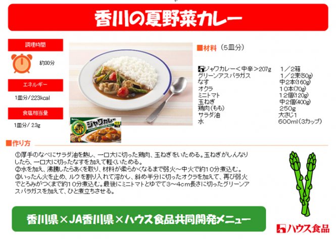 香川県、JA香川県、香川県漁連、ハウス食品の県産食材振興連携の一環として、県産野菜の地産地消推進と消費拡大を目的に、ハウス食品による地産地消カレーTVCMの放映と連動し、県産夏野菜とハウス食品のカレールゥによる「香川の夏野菜カレー」の試食宣伝販売を実施します。