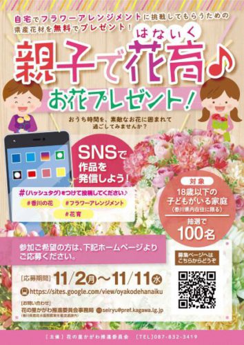 自宅でフラワーアレンジメント等の花育活動に取り組むご家族に、「香川県産花き取扱協力店」から、県産花きをお届けします。花育活動に取り組んだご家族には、作品の画像をSNSにハッシュタグ(「香川の花」、「親子で花育」など)を付けて投稿してもらいます。