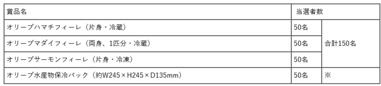 オリーブハマチ、オリーブぶり、オリーブマダイ、オリーブサーモンの購入者を対象に、抽選でプレゼントが当たります。