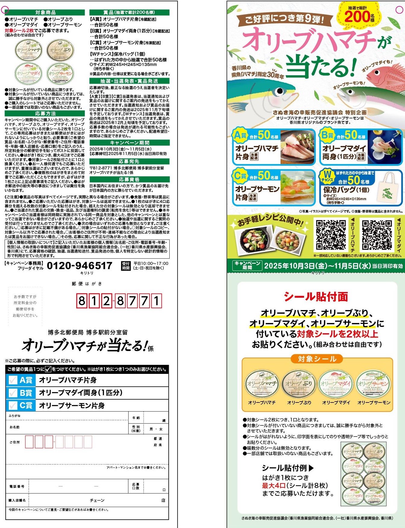 【応募方法】 対象商品添付のオリーブハマチ、オリーブぶり、オリーブマダイ、オリーブサーモンシール2枚一口(組み合わせ自由)とし、専用応募はがきまたは郵便はがきに、下記必要事項を記載のうえ、下記宛先へ郵送してください。はがき1枚あたり最大4口までとします。