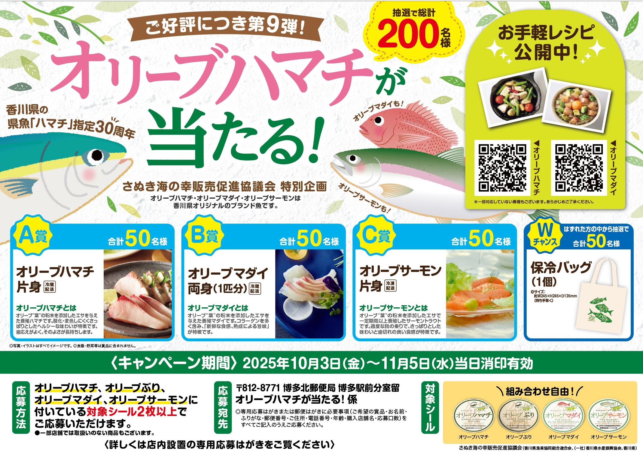 平成19年の誕生から18年が経過し、秋の味覚として定着したオリーブハマチが10月3日から販売され、同日よりオリーブハマチが当たる!プレゼントキャンペーンも開始します。