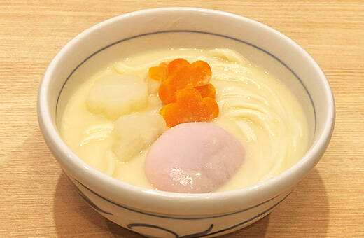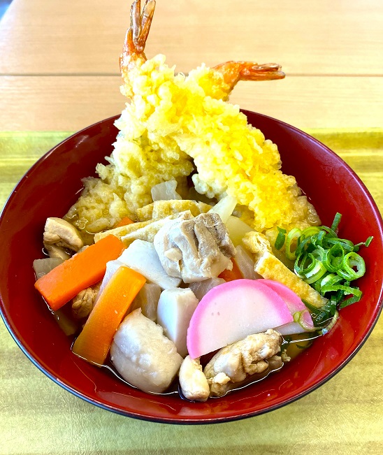 讃岐の郷土料理しっぽくうどんに大海老を2本トッピングしました。うどんの白、大海老の赤でおめでたく新年を祝う年明けうどんとして召し上がって下さい。