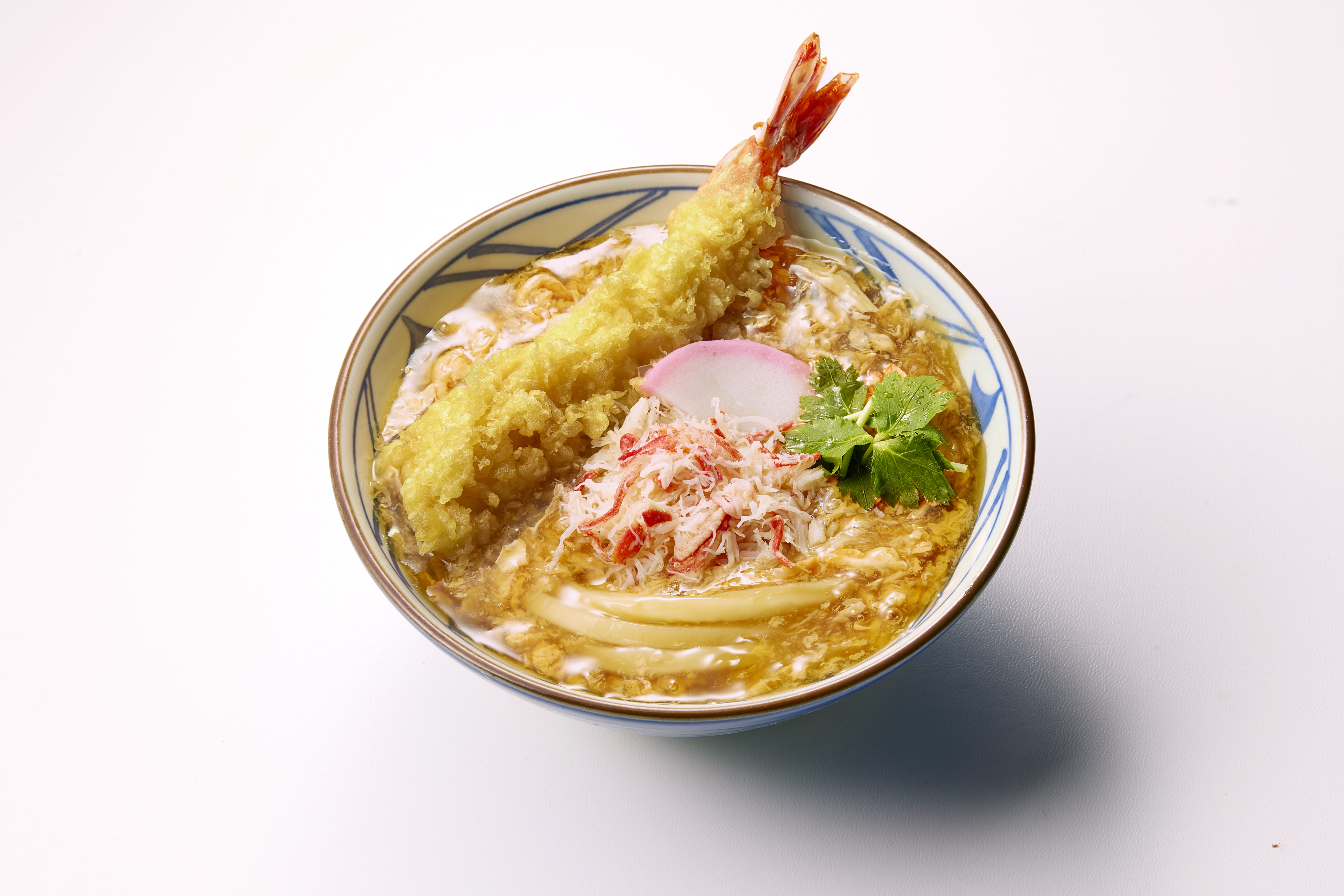赤い「海老ちくわ」と「きつねあげ」「生たまご」をトッピングした年の初めに食べて欲しい、おめでたいおうどん。