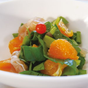 ②のジェラート、③のうどん餡餅、すももを半分に切ったものをトッピングし、タレをお好みでかけてできあがり。