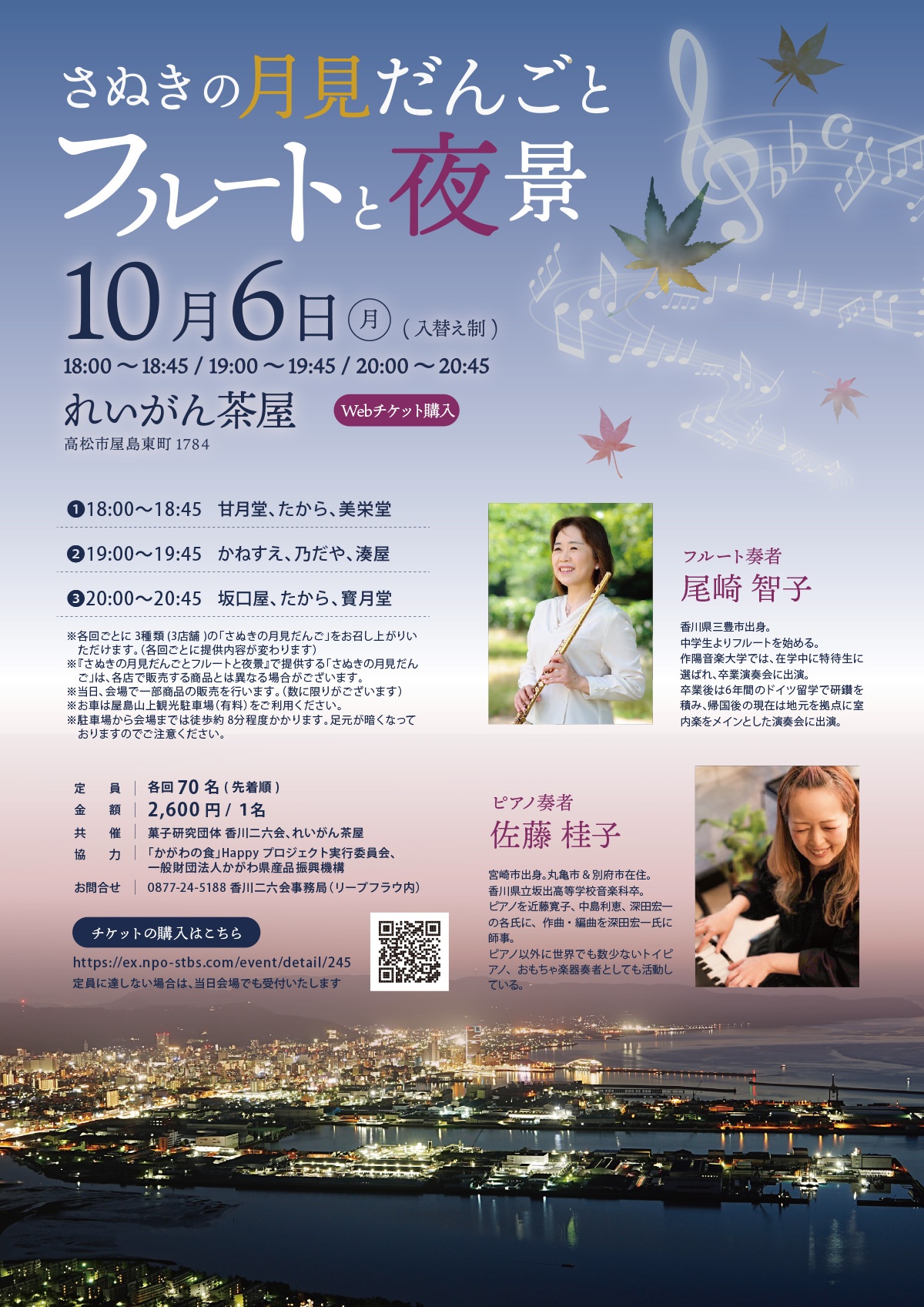 さらに、れいがん茶屋にて、フルートとピアノの演奏を聴きながら、参加和菓子店の月見だんごを召し上がっていただける「さぬきの月見だんごとフルートと夜景」を開催します。